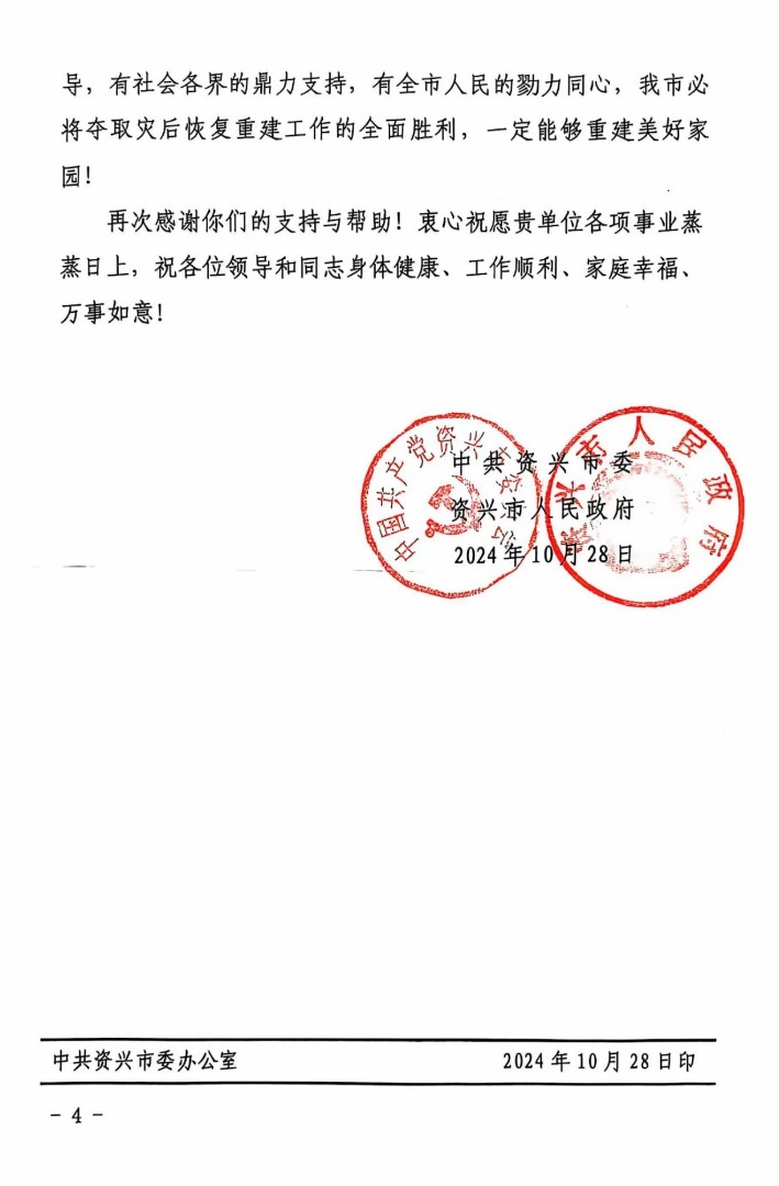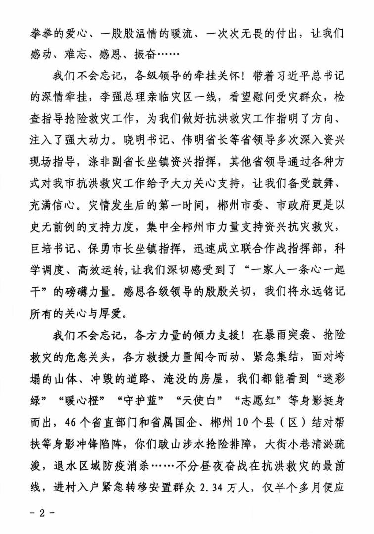 近日,中共資興市委、資興市人民政府發(fā)來感謝信,信中高度評(píng)價(jià)了湖南省交通規(guī)劃勘察設(shè)計(jì)院有限公司在馳援資興搶險(xiǎn)救災(zāi)及災(zāi)后恢復(fù)重建工作中展現(xiàn)的擔(dān)當(dāng)精神和技術(shù)水平,對(duì)公司作出的積極貢獻(xiàn)表達(dá)了誠摯的感謝。