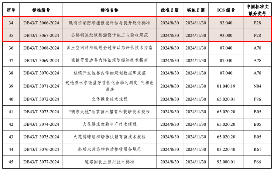 11月30日,由湖南省交通規(guī)劃勘察設(shè)計(jì)院有限公司主編的省級(jí)地方標(biāo)準(zhǔn)《既有橋梁防船撞性能評(píng)估與提升設(shè)計(jì)標(biāo)準(zhǔn)》(DB43/T 3066-2024)、《公路鋼波紋板橋涵設(shè)計(jì)施工與驗(yàn)收規(guī)范》(DB43/T 3067-2024)正式實(shí)施,其中《既有橋梁防船撞性能評(píng)估與提升設(shè)計(jì)標(biāo)準(zhǔn)》填補(bǔ)了國內(nèi)該領(lǐng)域空白。此外,交通設(shè)計(jì)院主編的《公路橋梁預(yù)應(yīng)力混凝土管樁應(yīng)用技術(shù)規(guī)程》(DB43/T 3085-2024)也將于2025年2月13日起實(shí)施,為我省交通基礎(chǔ)設(shè)施建設(shè)提供有力的技術(shù)支撐。