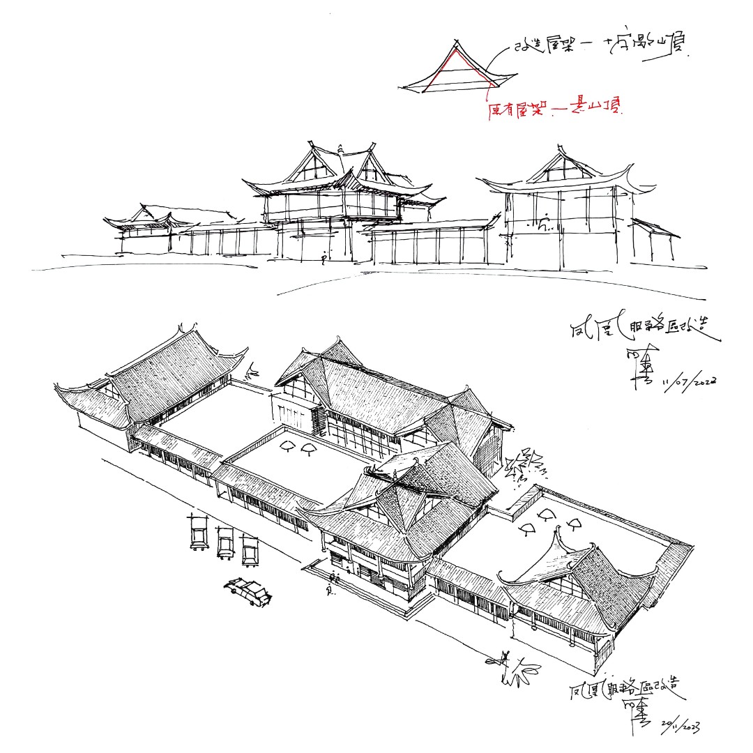 服務區(qū)建筑立面的改造設計為項目一大亮點。設計團隊深入挖掘當地傳統(tǒng)民居元素,通過歇山頂屋架形式和飛檐翹角等傳統(tǒng)構造彰顯苗寨風情,使服務區(qū)在保持現代服務功能便捷性、舒適性的同時,又充滿了吊樓古韻、水鄉(xiāng)風情的地域特色。