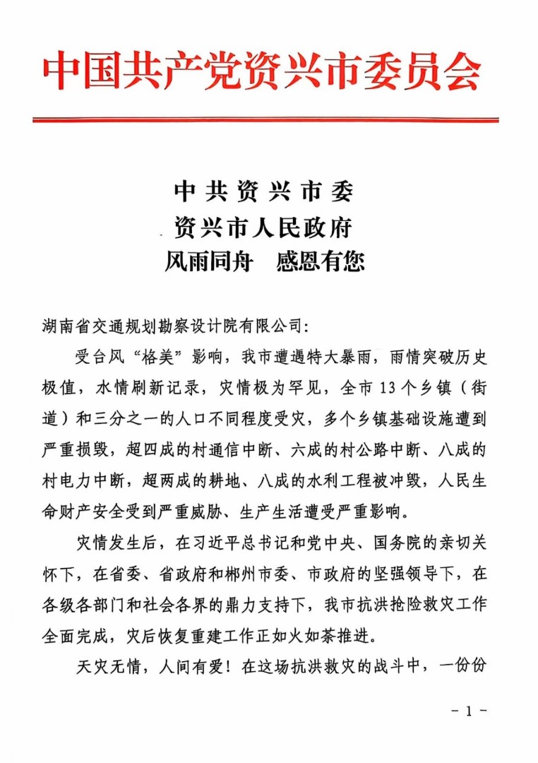 近日,中共資興市委、資興市人民政府發(fā)來感謝信,信中高度評(píng)價(jià)了湖南省交通規(guī)劃勘察設(shè)計(jì)院有限公司在馳援資興搶險(xiǎn)救災(zāi)及災(zāi)后恢復(fù)重建工作中展現(xiàn)的擔(dān)當(dāng)精神和技術(shù)水平,對(duì)公司作出的積極貢獻(xiàn)表達(dá)了誠(chéng)摯的感謝。信中指出,資興市此次遭遇災(zāi)情極為罕見,多地基礎(chǔ)設(shè)施遭到嚴(yán)重?fù)p毀、大范...