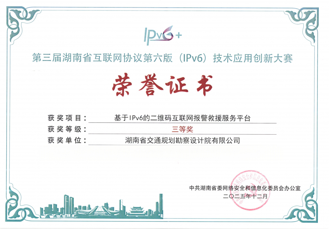 近日,第三屆湖南省IPv6技術(shù)應(yīng)用創(chuàng)新大賽頒獎(jiǎng)儀式在長沙舉行。大賽由省委網(wǎng)信辦主辦,旨在挖掘IPv6技術(shù)應(yīng)用創(chuàng)新成果,推動(dòng)其在重點(diǎn)領(lǐng)域深度應(yīng)用。湖南交通設(shè)計(jì)院牽頭申報(bào)的“基于IPv6的二維碼互聯(lián)網(wǎng)報(bào)警救援服務(wù)平臺(tái)”項(xiàng)目榮獲三等獎(jiǎng)。 項(xiàng)目聚焦高速公路應(yīng)急救援痛點(diǎn),依托IPv...