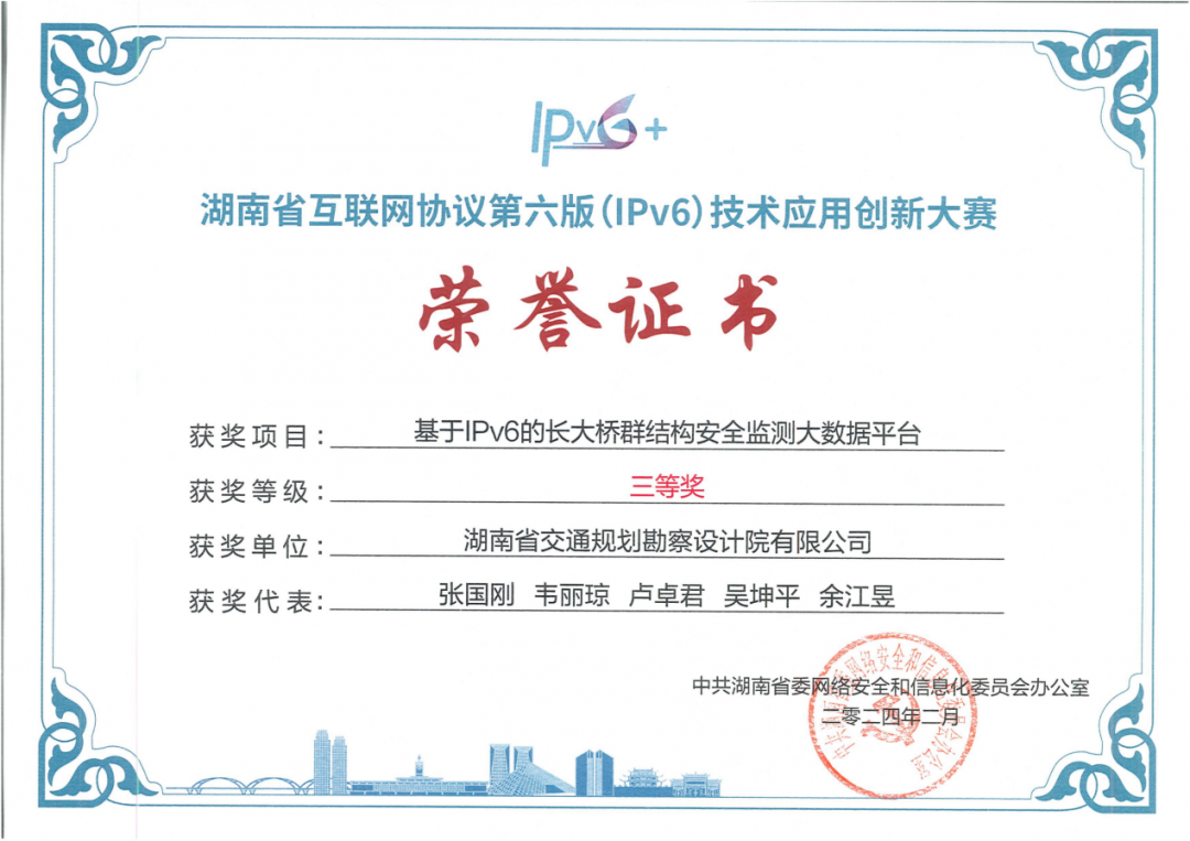 2月1日,由湖南省委網(wǎng)信辦主辦的湖南省互聯(lián)網(wǎng)協(xié)議第六版(IPv6)技術(shù)應(yīng)用創(chuàng)新大賽頒獎(jiǎng)儀式在長(zhǎng)沙舉行,湖南交通設(shè)計(jì)院開(kāi)發(fā)的“基于IPV6的長(zhǎng)大橋群結(jié)構(gòu)安全監(jiān)測(cè)大數(shù)據(jù)平臺(tái)”喜獲大獎(jiǎng)。 IPV6為下一代IP協(xié)議,其數(shù)據(jù)傳輸安全性、傳速效率等優(yōu)于IPV4,是互聯(lián)網(wǎng)演進(jìn)升級(jí)的必然趨勢(shì)、...