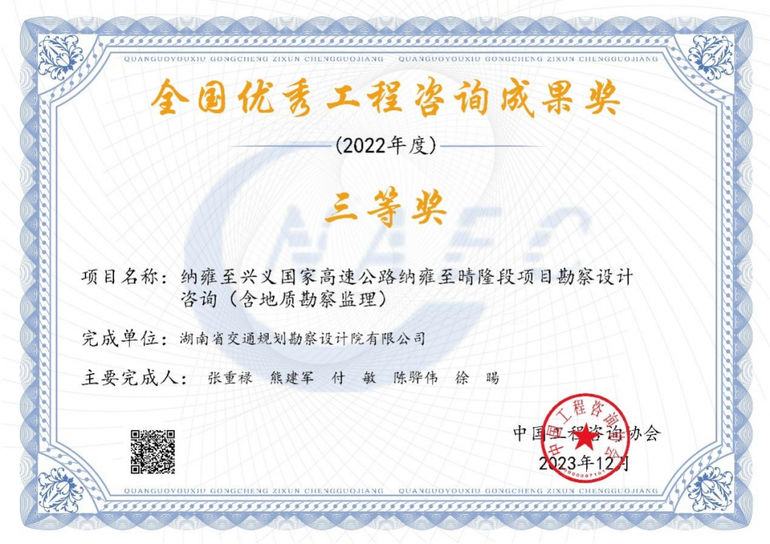 近日,中國(guó)工程咨詢協(xié)會(huì)公布2022年度全國(guó)優(yōu)秀工程咨詢成果獎(jiǎng)獲獎(jiǎng)項(xiàng)目,湖南交通設(shè)計(jì)院承擔(dān)的納雍至興義國(guó)家高速公路貴州省納雍至晴隆段勘察設(shè)計(jì)監(jiān)理咨詢榮獲全國(guó)優(yōu)秀工程咨詢成果獎(jiǎng)。 全國(guó)優(yōu)秀工程咨詢成果獎(jiǎng)是工程咨詢行業(yè)的最高獎(jiǎng)項(xiàng),旨在表彰和獎(jiǎng)勵(lì)在我國(guó)工程咨詢業(yè)務(wù)...
