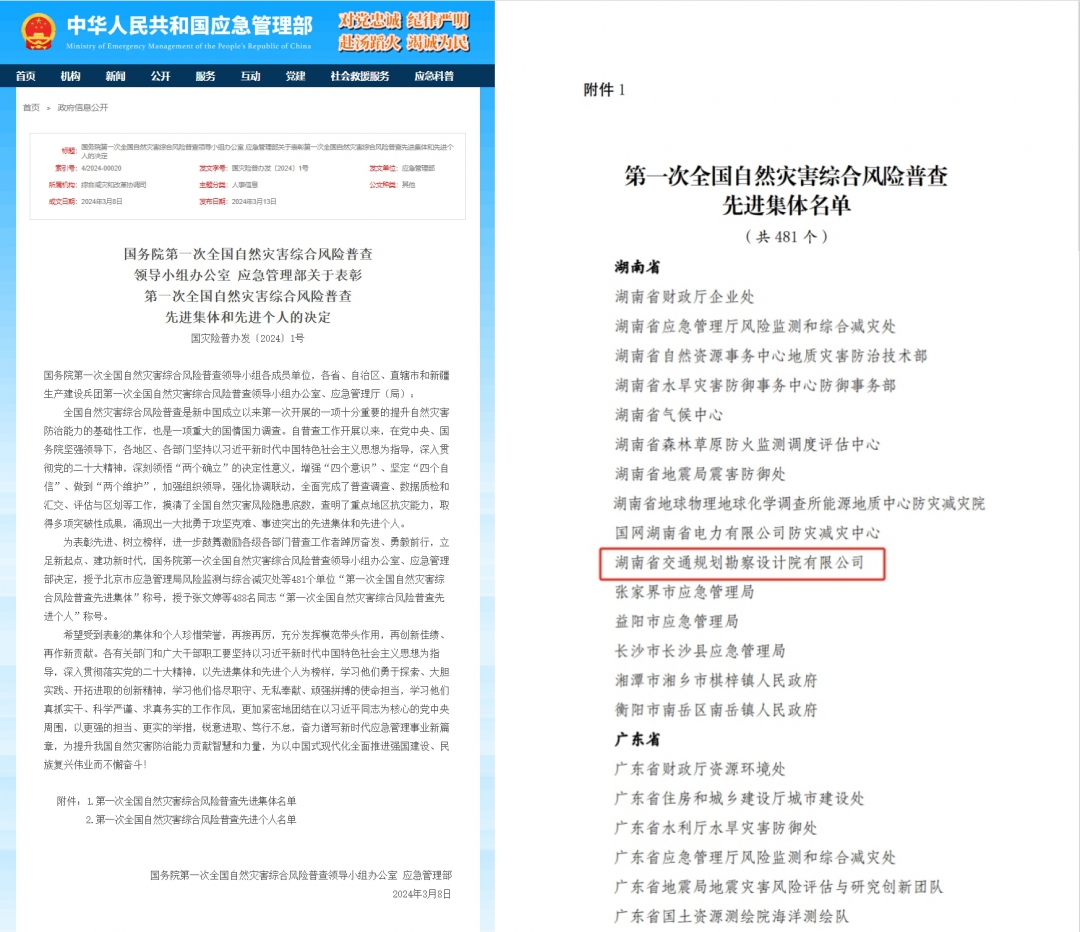 日前,國(guó)務(wù)院第一次全國(guó)自然災(zāi)害綜合風(fēng)險(xiǎn)普查領(lǐng)導(dǎo)小組辦公室、應(yīng)急管理部發(fā)布“第一次全國(guó)自然災(zāi)害綜合風(fēng)險(xiǎn)普查先進(jìn)集體和先進(jìn)個(gè)人”名單,湖南交通設(shè)計(jì)院被授予“第一次全國(guó)自然災(zāi)害綜合風(fēng)險(xiǎn)普查先進(jìn)集體”榮譽(yù)稱號(hào)。 2020年5月,國(guó)務(wù)院辦公廳印發(fā)《關(guān)于開(kāi)展第一次全國(guó)自然災(zāi)...